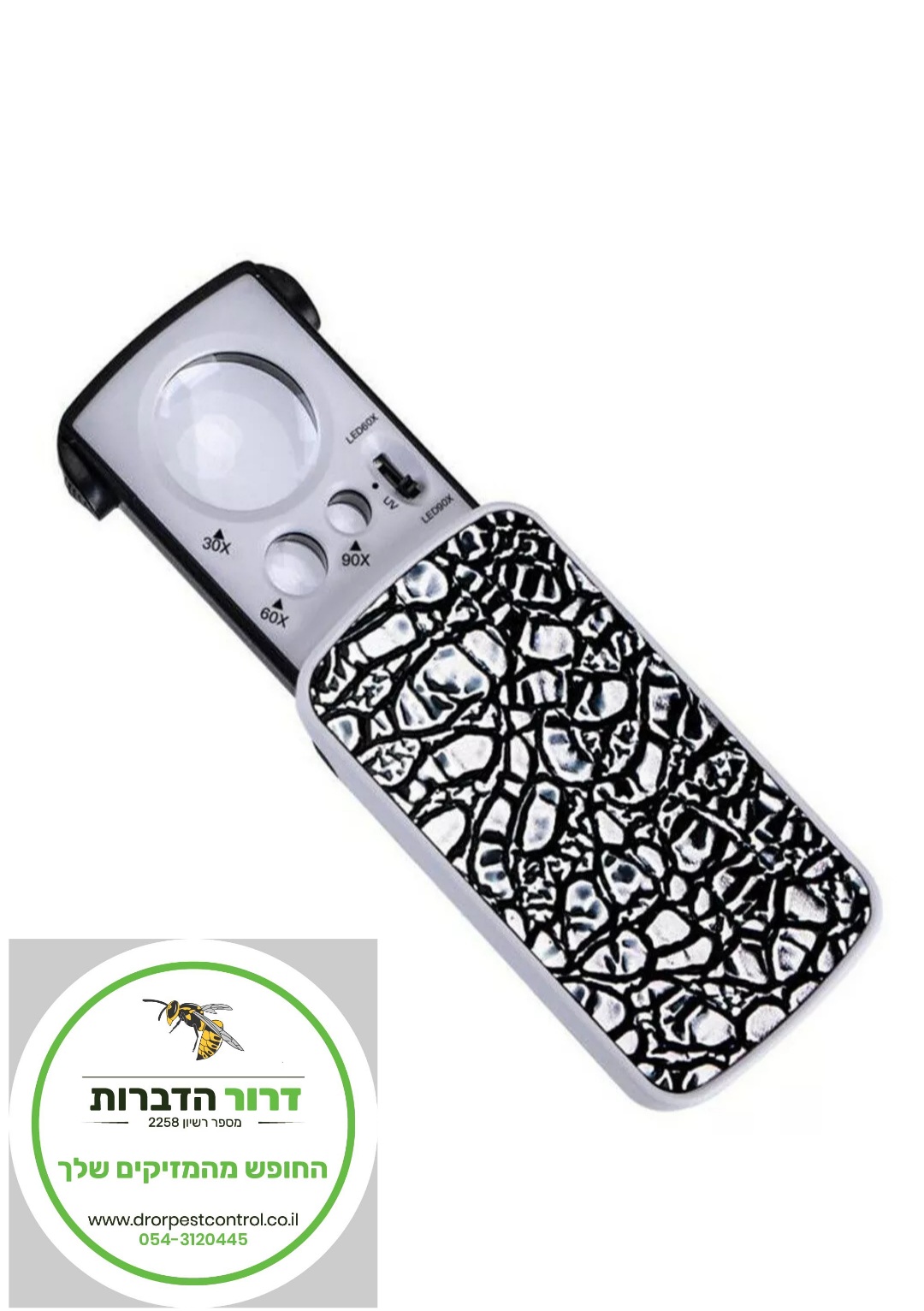 זכוכית מגדלת "לופה" מקצועית לזיהוי חרקים עם נורת לד zoom ×30, ×60, ×90