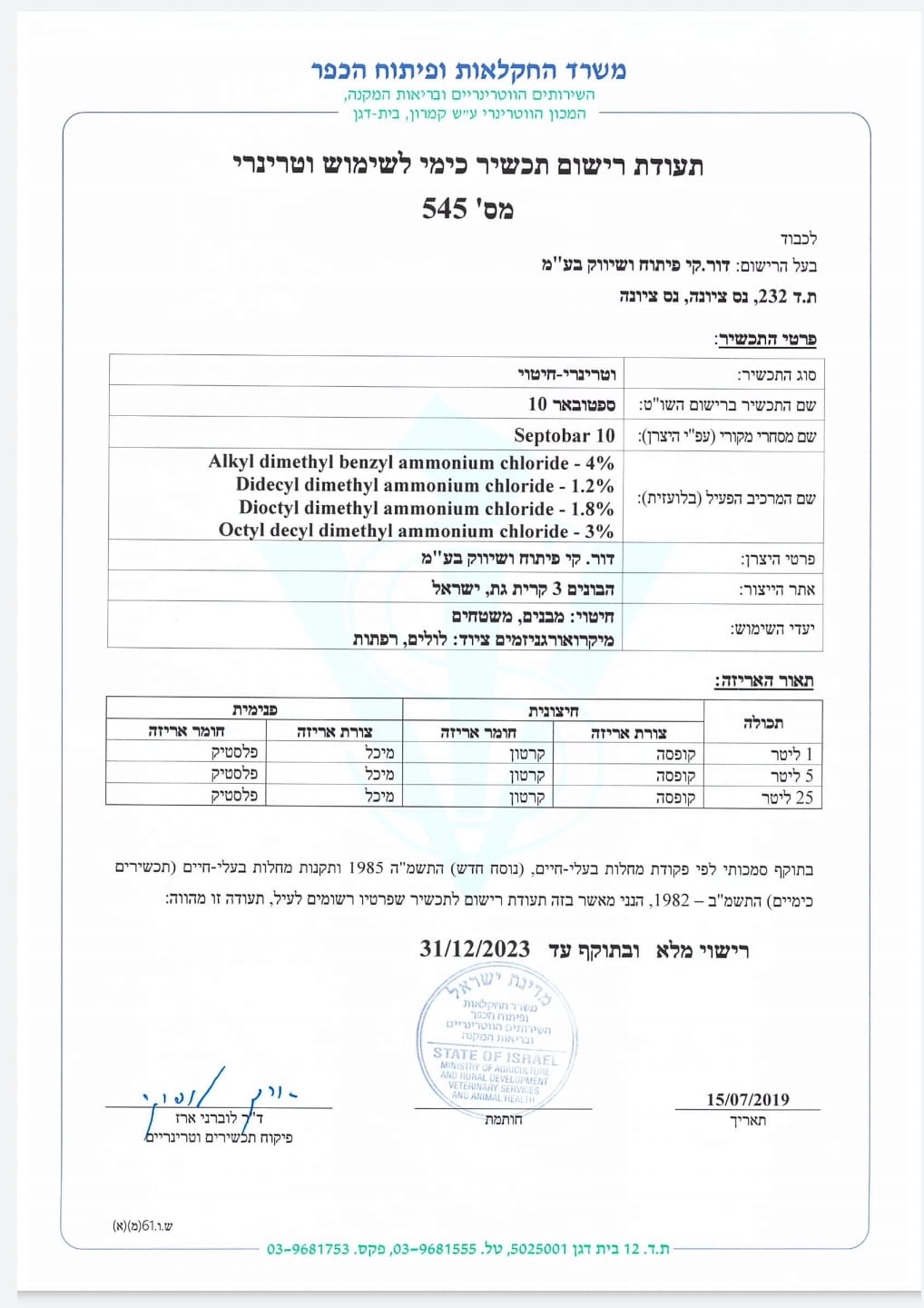 תכשיר חיטוי נגד קורונה, חיידקים, וירוסים, פטריות עובש ועוד. מתאים לריסוס ערפול וחיטוי של משטחים, כלים, רפתות, מטבחים, ידיות, רכבים, משקופים, דלתות, קירות ועוד... תכשיר מאושר על ידי משרד הבריאות. יחס דילול 0.5%-1% בין 5 סמ"ק- 10 סמ"ק לליטר. סך הכל תכשיר עבור 100 ליטר או 200 ליטר. מלאי מוגבל!